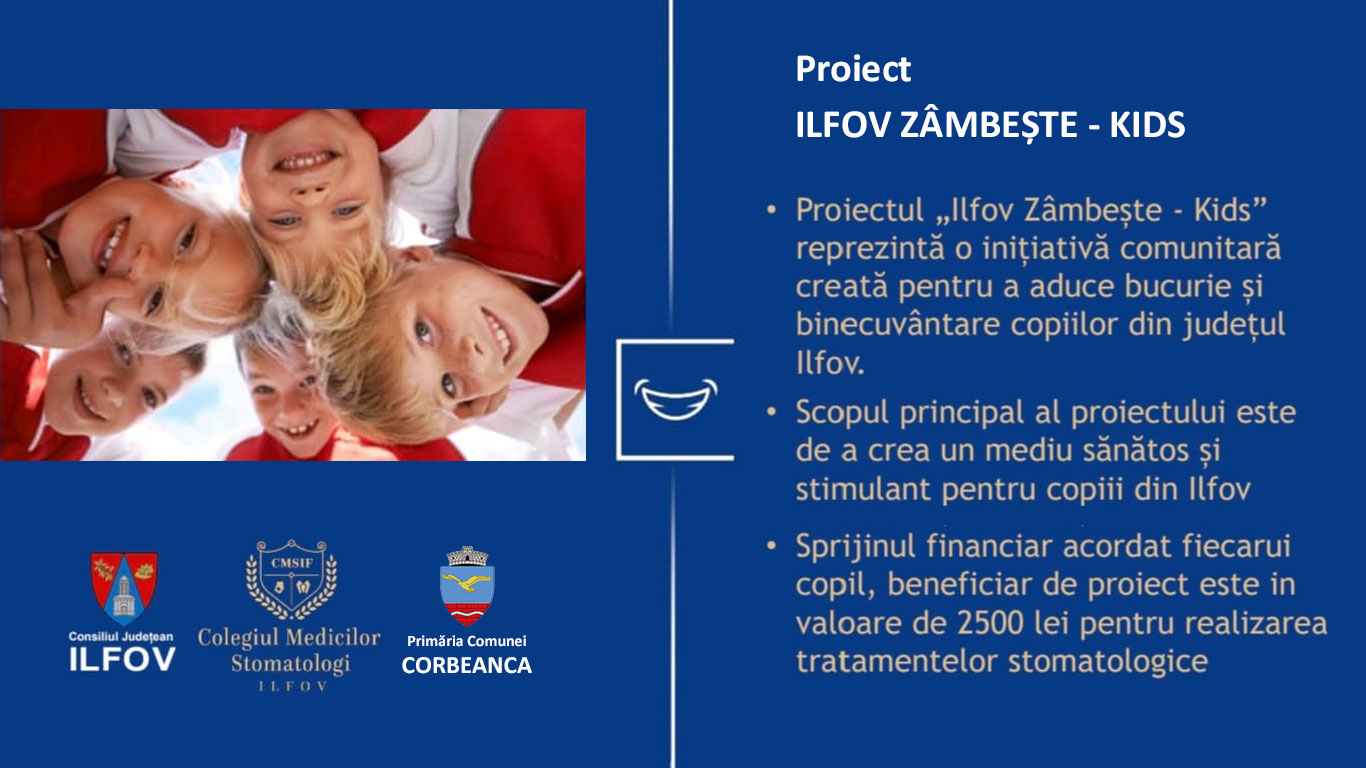 Județul Ilfov – Consiliul Județean își propune să continue politica de dezvoltare locală, prin acordarea unui sprijin financiar nerambursabil pentru copii și adolescenți, indiferent de categorie socială, etnie ori status fizic și mental, prin asigurarea sumelor necesare pentru tratamentul stomatologic din bugetul Județului Ilfov- Consiliul Județean, cu sprijinul unităților administrativ teritoriale din județ, în cadrul Proiectului „Ilfov zâmbește junior”.