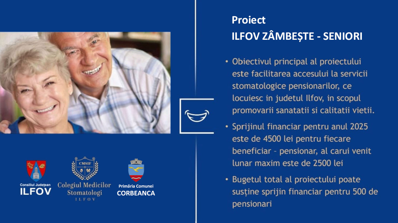 Buget Valoarea totală a proiectului este de 2.220.000 lei, respectiv tratamente stomatologice în cuantum de 2.160.000 lei (maxim 4.500 lei pentru fiecare pensionar si sa se încadreze în numărul de 480 de cereri aprobate pentru acordarea sprijinului financiar, la nivelul județului Ilfov) precum și materiale informative în valoare de max. 60.000 lei din bugetul proiectului.